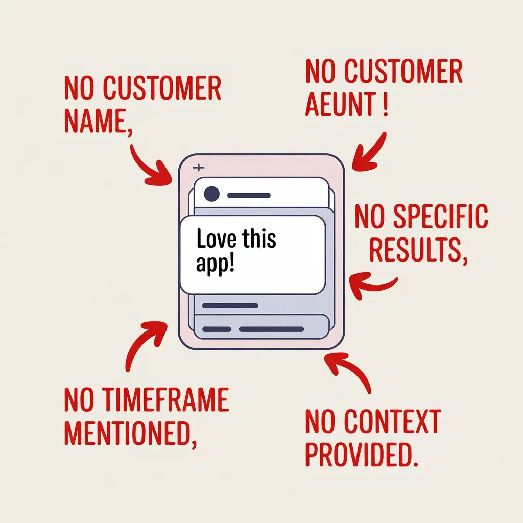 "Great product!" or "Love this app!" testimonials add zero value. Visitors see them and think, "Okay, but why?" They provide no proof of results.